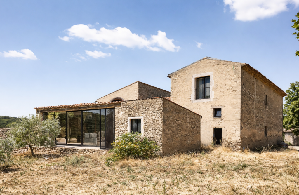 La réhabilitation du mas privilégie la conservation maximale des matériaux d’origine : maçonneries en pierre, enduits traditionnels, éléments structurels existants. Les interventions sont volontairement mesurées, cherchant à préserver la patine du temps et l’authenticité des lieux.