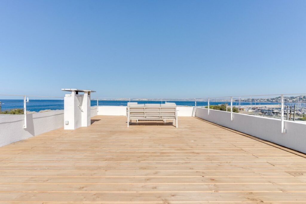Le cabinet a repensé la maison en transformant la façade principale. Un balcon surmonté d’une pergola ont été créés dans le but de sublimer la façade dans son style d’origine. Le nouveau balcon en surplomb domine la vue mer depuis la Villa. Il permet d’accéder à la grande toiture terrasse depuis laquelle on peut admirer les majestueux couchers de soleil.
