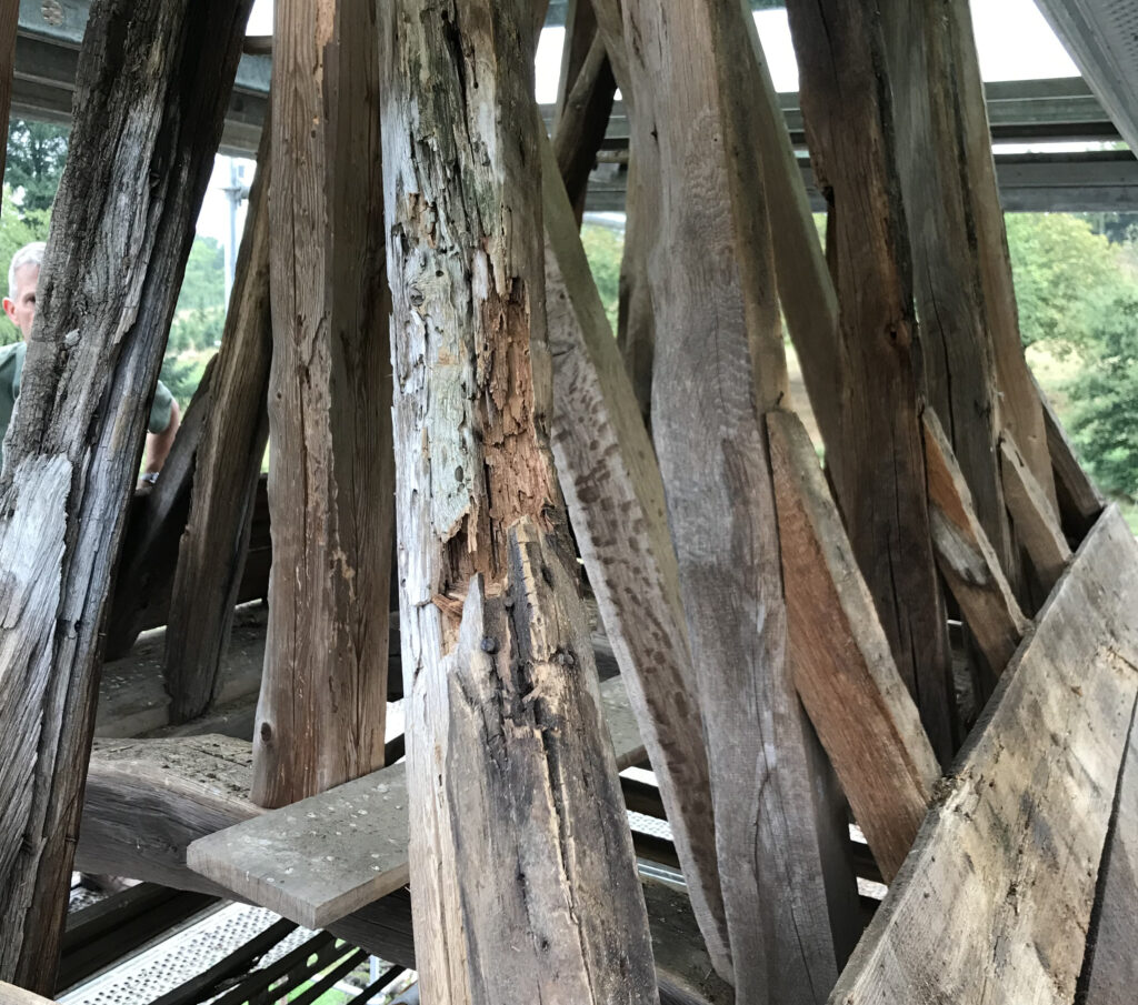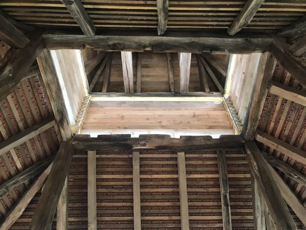 L’ensemble de la charpente a été révisée en conservant sa structure et ses assemblages d’origine. Les bois ont fait l’objet d’un traitement adapté, puis d’une lasure, permettant leur protection durable tout en révélant la matérialité et la lecture constructive de l’ouvrage.